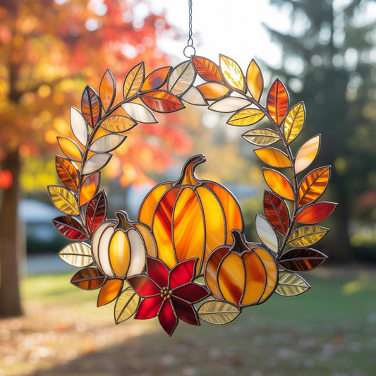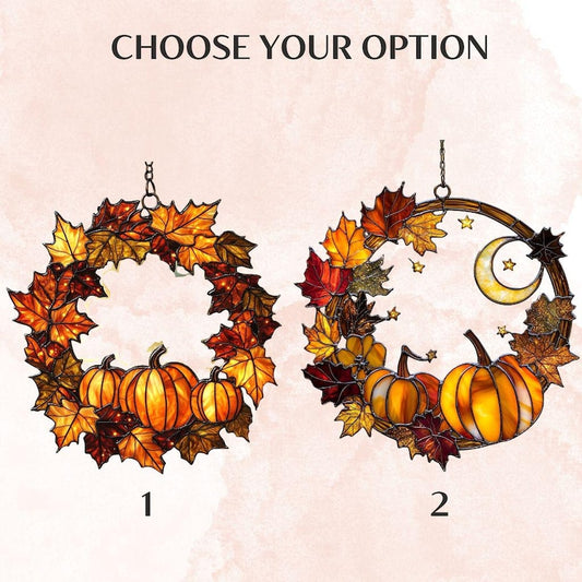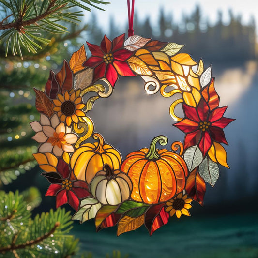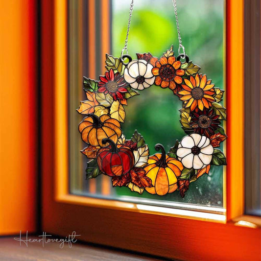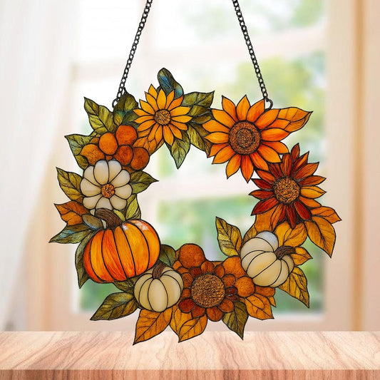 Autumn Pumpkin Wreath Acrylic Suncatcher, Faux Stained Glass Sunflower Window Hanging Fall Seasonal Decoration forCozy Home and Harvest Gift