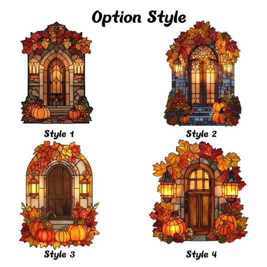 Autumn Cottage Door Acrylic Suncatcher, Cozy Porch Faux Stained Glass Window Hanging With Lantern Lights, Pumpkins And Maple Leaves Decor