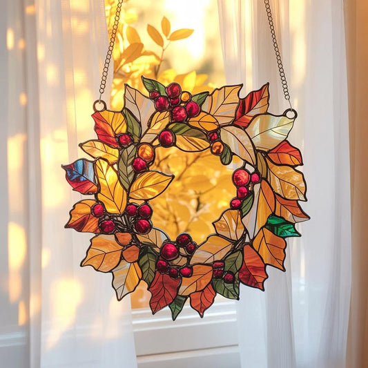 Fall Leaves Wreath Acrylic Window Hanging, Autumn Harvest Faux Stained Glass Suncatcher, Maple Leaf Door Decor Thanksgiving Gift Idea